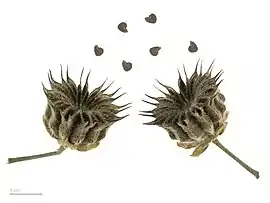 Плод — сложная звездообразная коробочка с 12—25 гнёздами, тёмная, с мягким опушением, сверху в очертании звёздчатая, каждое гнездо вскрывается в верхней части и содержит 2—3 семени. Семена крупные, почковидные, серовато-коричневые, длиной и шириной 2,7—3,3, толщиной 1,5—1,7 мм. Масса 1000 семян 8—12 г.