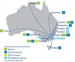 | QantasLink | Аделаида, Брисбен, Кэрнс, Дарвин, Хобарт, Мельбурн, Саншайн-Кост, Сидней Сезонные: Байрон-Бей, Голд-Кост |