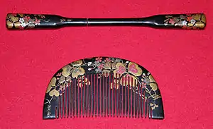 - Куси (яп. 櫛, гребень): поддерживает верх причёски. Куси тоже часто выделяются из понятия «кандзаси». Так как в японском языке слово «куси» омонимично слову куси (яп. 苦死, мучительная смерть), куси редко дарят. Куси часто делают из черепахового панциря и лакированного дерева. Куси украшают жемчугом и перламутром, золотой фольгой (на куси часто выполняется макиэ (яп. 蒔絵) — лаковая миниатюра, покрывающаяся золотым или серебряным порошком). Верхняя кромка гребня обычно не украшается. Европейский гребень значительно отличается от куси узким верхом. Ещё одно отличие заключается в том, что у японских гребней нет зубьев по бокам, это следствие разделения японских причёсок на части: лобная, боковые, теменная, затылочная; куси должен их соединять. В «мире цветов и ив» получили популярность богато украшенные гребни с широким основанием.