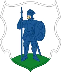 Гербом Канева со времён Речи Посполитой служило изображение воина с копьём или алебардой (видимо, в память о военном значении города). В описании герба, утверждённого Николаем I 26 декабря 1852 года, он толковался как «русский ратник XII века» и помещался на чёрном поле; самый герб был увенчан городской короной (элемент, перешедший в современный герб). Нынешний герб Канева утверждён горсоветом 7 декабря 1999 года. В лазурном поле на серебряном холме древнерусский ратник XII века в серебряных доспехах, красной накидке, сапогах и перчатках, с мечом в красных ножнах и красным щитом держит правой рукой боевую секиру с длинным черенком. Щит обрамлён декоративным картушем и увенчан серебряной городской короной с тремя башнями. Герб города спроектирован на основании прежних гербов XVIII—XIX веков, подчеркивая существование Канева уже в XII веке.[15]