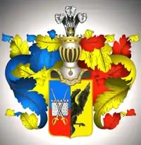 Щит увенчан дворянскими шлемом и короной. Нашлемник: три страусовых пера. Намёт на щите голубой и золотой, подложенный золотом и красным.