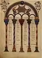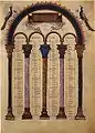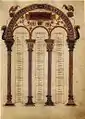 ![]() Страница из латинского хронографа 354 года, копия XVII века. Codex Vaticanus Barberini latinus, Апостольская библиотека, Ватикан. | ![]() Таблицы канонов из Адишской грузинской рукописи Евангелий 897 г.. Этнографический музей Местиа, Грузия. |