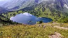 Горный хребет порос темнохвойной тайгой, на вершинах хребта — лишайниковая горная тундра.
