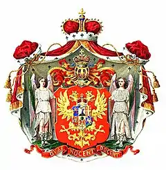 В червлёном щите золотой двуглавый коронованный орёл, имеющий на груди щит дважды рассечённый и раз пересечённый. В первой серебряной части человек в лазоревой одежде, на коленях на чёрной скале и со сложенными руками, из правого верхнего угла части выходящая из лазоревого облака рука, держащая зелёную пальмовую ветвь (Герб рода Ангелов). Во второй лазоревой части византийская царская золотая корона, поддерживаемая двумя руками в червлёной одежде, выходящими с боков (Герб рода Комнинов). В третьей части, в червлёном поле золотой крест, имеющий в углах четыре золотые буквы «В» противообращенные (Герб Палеологов). В четвёртой золотой части два противупоставленные червлёные льва с чёрными глазами и языками держат передними лапами зелёное оторванное дерево (Герб князей Кантакузинов). В пятой лазоревой части золотая голова буйвола с червлёными глазами и рогами, между которых серебряная пятиконечная звезда, сопровождаемая справа серебряной розой о шести шипах, слева серебряным полумесяцем, рогами к голове буйвола обращённым (Герб Молдавии). В шестой лазоревой части золотой, стоящий на зелёной скале, ворон с червлёными глазами и языком, держащий в клюве золотой крест, сопровождаемый вверху золотым же солнцем и полумесяцем (Герб Валахии). Щиток увенчан короной великого магистра ордена Св. Константина.