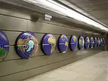 В первом вестибюле находится экспозиция из 12 моделей земного шара, на которых изображены материки Земли, авторства Альфонса Сольдевилы. (кат. Alfons Soldevila).[1]