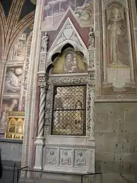 Витражи левого окна созданы Таддео Гадди. Вверху изображен герб Барончелли, ниже — стигматизация Святого Франциска[6][7] (фото), ещё ниже — изображения пророков и святых.