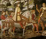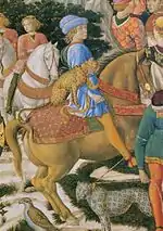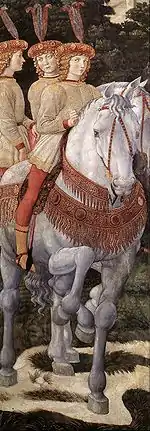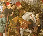 Во главе процессии скачет молодой волхв в окружении пажей (Лоренцо Великолепный). |