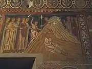 - Диспут папы и раввина Замврия. Раввин одним словом убивает дикого быка, а папа своей молитвой оживляет зверя. В числе почитателей Замврия изображена святая Елена, уже монотеистка, но ещё не христианка.
