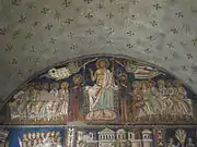 В люнете над входом (западная стена, над историей Константинова дара) представлена сцена Второго пришествия. Христос восседает на троне, в Его левой руке крест, под правой — орудия Страстей: терновый венец, гвозди и губка с уксусом. Справа Христу предстоят Богородица и шесть апостолов во главе с Павлом, слева — Иоанн Креститель и другие шесть апостолов с Петром. В тёмном небе парят два ангела: левый трубит, а правый держит в руках свиток с изображением затемнённого солнца и звёзд.