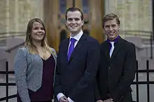 Первое лидерство партии, перед зданием парламента: Агнетте Юнсен, Эспен Хаген Хаммер и Петтер Хагелиен (лидер Капиталистической молодёжи)