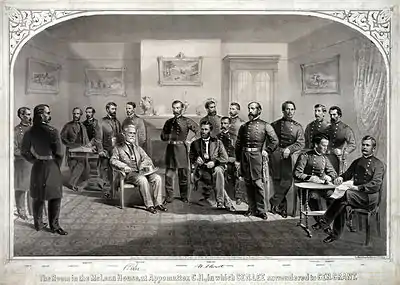 На встрече также было решено собрать комиссию, которая бы оформила детали капитуляции и организовала печать пропусков[''i'' 3]. Для этого было решено выделить по три офицера с каждой стороны. Это были Джон Гиббон, Уэсли Мерритт и Чарльз Гриффин со стороны Гранта и Джеймс Лонгстрит, Джон Гордон и Уильям Пендлетон со стороны Ли. Эта комиссия решила собраться в Кловер-Хилл-Таверн, но это здание оказалось скорее амбаром, чем жилым домом, поэтому офицеры переместились в тот самый дом Маклина, где была подписана капитуляция[17][18]. «Члены комиссии… выбрали комнату в доме Маклина, — вспоминал потом Лонгстрит, — путь туда вёл через комнату, которую занимал штаб Гранта. Когда я проходил через эту комнату в качестве члена комиссии, Грант посмотрел в мою сторону, узнал меня, встал и с добродушием, как в старые добрые времена, протянул мне руку и после пары фраз предложил мне сигару, которая была с благодарностью принята»[19].