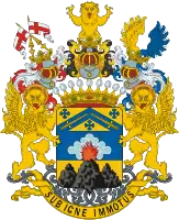 Описание герба: Выписка из Гербовника Золотой щит пересечён лазоревым поясом, в коем червлёное пламя и серебряный дым. В нижней части чёрная с тремя вершинами гора, извергающая червлёное пламя и серебряный дым. В верхней части лазоревое стропило, в каждой части которого по золотому мечу, остриями друг к другу. Над стропилом два и под стропилом один лазоревый крест с широкими закруглёнными концами. Над щитом графская корона с тремя графскими коронованными шлемами. Нашлемники: средний — сидящий прямо золотой лев с поднятыми передними лапами с червлёными глазами и языком; правый — накрест два георгиевских знамени: серебряные с червлёными крестами на золотых древках; левый — два орлиных крыла, из коих правое — золотое, левое — лазоревое. Наметы: среднего шлема — чёрный с золотом; правого — червлёный с серебром; левого — лазоревый с золотом. Щитодержатели: два золотых льва Св. Марка с головами, обращёнными к зрителю, с червлеными глазами и языками. Девиз: «Sub igne immotus» чёрными буквами на золотой ленте. Герб рода графов Капнистов внесён в Часть 13 Общего гербовника дворянских родов Всероссийской империи (страница 13). |