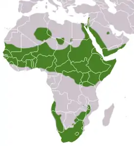 Распространён от Сирии, Израиля и Северо-Восточной Африки до ЮАР. Южнее Сахары обитает почти повсеместно. Изолированные популяции имеются в горах Ливии и Алжира.