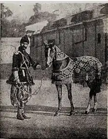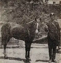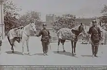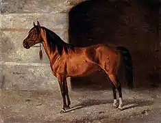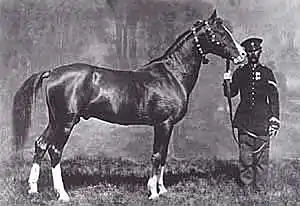 ![]() Жеребец Альетмез из завода Хуршидбану Натаван (княгини Уцмиевой), премированный на Всероссийской выставке 1867 года | |