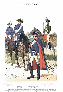 В 1776 году вместо кафтанов вводят колеты, как у кирасир, но с такой же как и раньше расцветкой — синие с красными воротниками и обшлагами. По борту, полам, воротнику и обшлагам колет обшивается жёлтой гарусной тесьмой. Вместо погона теперь носится небольшой эполет, жёлтого цвета для всех полков, на правом плече аксельбант. Поверх колета надевается красный кушак, на левом боку носится кожаная сумка-ташка обшитая красным сукном, с вышитым императорским вензелем.