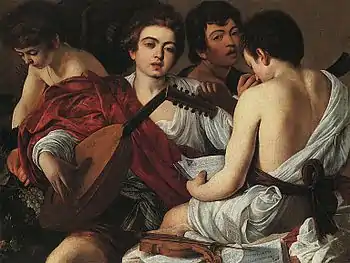 «Музыканты» (1595). Караваджо написал себя с рожком между двумя музыкантами.