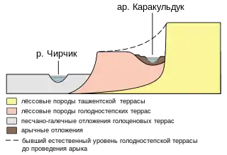 Многовековая эксплуатация канала Каракульдук привела к изменениям рельефа. До его проведения уклон местности выше Янгиюля был направлен в сторону реки Чирчик, после проведения — сменился на обратный, образовав долину с искусственной террасообразной поверхностью. Существенно понизился уровень естественной голодностепской террасы (позднечетвертичные лёссовые отложения), поверхность которой полого подходила к более высокой ташкентской террасе (среднечетвертичные лёссовые отложения). На границе двух этих террас, вдоль которой протекает Каракульдук, возник крутой уступ[3].