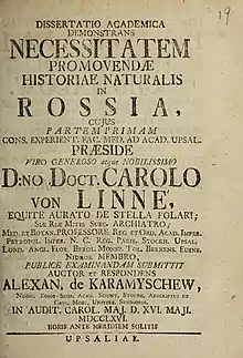 - Alexan. de Karamyschew. Dissertatio Academica Demonstrans Necessitatem Promovendae Historia Naturalis In Rossia, cujus partem primam praeside… Carolo von Linné… : [лат.] : [арх. 16 марта 2009]. — Holmiae : Apud Godofredum Kiesewetter, 1766. — 34, [10] s. — OCLC 69100523.