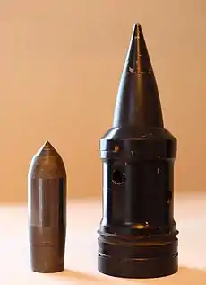 В послевоенное время, в 1960—1970-х годах в Швейцарии и ФРГ были разработаны и приняты на вооружение новые подкалиберные боеприпасы с твердосплавными сердечниками, в том числе малокалиберной артиллерии в калибрах 20×128 мм «Эрликон-Контравес» и 20×139 мм «Испано-Сьюза», выпускавшиеся по лицензии целым рядом стран. По мере накопления опыта их применения пришло также понимание недостатков металлокерамических сердечников, связанное, в первую очередь, с их склонностью к разрушению от изгибающих напряжений при взаимодействии с бронезащитой под большими углами от нормали. При увеличении угла взаимодействия с бронёй (от нормали) эффективность бронепробивного действия боеприпасов с металлокерамическим сердечником снижалась[10]. Кроме того, такие боеприпасы показали заметное снижение эффективности при стрельбе по разнесённым и экранированным бронепреградам вследствие их разрушения в результате резкого снятия напряжений сжатия после пробития первой преграды (экрана). Во второй половине 1970-х годов благодаря успехам в технологии вольфрамовых сплавов, позволившим повысить их пластичность до 5—7 %, были разработаны подкалиберные боеприпасы нового поколения, активная часть которых выполнялась уже из тяжёлого сплава на основе вольфрама (W-Ni,Co) или обеднённого урана (U-0,75 % Ti), обладавших определённым запасом пластичности. Новые выстрелы БПС с отделяемыми частями были лучше приспособлены для действия по бронецелям 1980—2000-х годов.