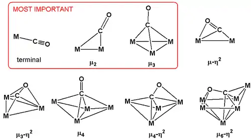 Карбонильный лиганд проявляет несколько мод связывания в димерах карбонилов металлов и кластерах. Наиболее распространённый тип связывания — мостиковый, когда СО-лиганд соединяет два атома металлов. Эта мода связывания наблюдается у многих общедоступных карбонилов: Co2(CO)8, Fe2(CO)9, Fe3(CO)12, и Co4(CO)12[1][22]. В некоторых высших кластерах CO-лиганд образует мостики между тремя или даже четырьмя атомами металлов, такие моды обозначаются μ3-CO и μ4-CO. Менее распространены моды связывания, в которых оба атома C и O связаны с атомами металла, например μ3-η2.