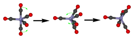Пентакарбонил железа проявляет только один сигнал в С13-ЯМР спектре из-за быстрого обмена аксиального и экваториального СО-лигандов при псевдоротации Берри.