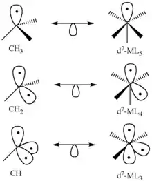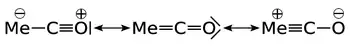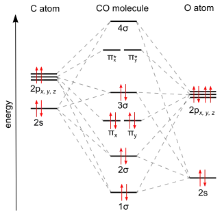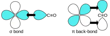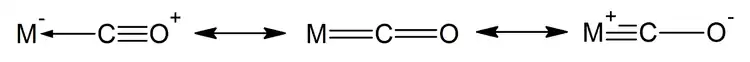 Монооксид углерода связывается с атомами переходных металлов по механизму обратного донирования (англ.: back-bonding, back-donation). Связывание состоит из трёх компонентов, что приводит к образованию частично тройной связи. Сигма связь возникает при перекрывании несвязывающей sp-гибридизированной орбитали (с парой электронов) на атоме углерода с d-, s- и р-орбиталями атома металла. Две π-связи образуются при перекрывании заполненных d-орбиталей атома металла с двумя π-разрыхляющими орбиталями атома углерода в молекуле СО. Последний вид связывания требует наличия у атома металла d-электронов и его относительно низкой степени окисления (<+2), в противном случае обратное донирование не является выгодным. Как только электроны металла заполняют π*-разрыхляющие орбитали СО, они ослабляют связь углерод-кислород по сравнению со свободной молекулой монооксида углерода, в то время как связь металл-углерод усиливается. Множественный характер связи М-СО приводит к укорочению расстояния металл-углерод, которое часто меньше 1,8 Â, что примерно на 0,2 Â короче, чем связь металл-алкил. Описать приблизительный механизм связывания молекулы CO с атомом металла можно с использованием резонансных структур канонических форм молекул.