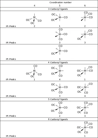 Наиболее важным методом характеризации карбонилов металлов является инфракрасная спектроскопия[33]. Колебания C-O в газообразной свободной молекуле (обозначающиеся νCO) наблюдаются при 2143 см−1. Положение полос поглощения νCO карбонилов металлов связано с энергией ИК-активных колебательных мод, и коррелирует с прочностью связи углерод-кислород и обратно коррелирует с силой обратного донирования (англ. Backbonding) с d-орбиталей металла на π-орбитали углерода. π-основность металлического центра зависит от многих факторов: в изоэлектронном ряду от Ti к Fe (в нижней части этого раздела), гексакарбонилы проявляют уменьшение степени обратного донирования (π-backbonding) вслед за увеличением положительного заряда на металле. π-основные лиганды увеличивают плотность π-электронов на атоме металла, а также компенсируют снижение частоты, соответствующей νCO, вызванное обратным донированием. Электронный параметр Толмена использует фрагмент Ni(CO)3 для упорядочивания лигандов по их π-донирующей способности[34][35]. Число колебательных мод карбонильного комплекса металла может быть определено с помощью теории групп. Только те колебательные моды, которые преобразуются как оператор электрического дипольного момента, будут иметь ненулевое произведение групп и будут наблюдаются в ИК-спектре. Таким образом, можно предсказать число наблюдаемых ИК-переходов (но не их энергии)[36][37][38]. Например, CO-лиганды октаэдрических комплексов, например, Cr(CO)6, трансформируются как a1g, eg, и t1u, но только мода t1u (антисимметричное растяжение шапочных карбонильных лигандов) является ИК-активной. Таким образом, только одна полоса поглощения νCO наблюдается в ИК-спектрах октаэдрических гексакарбонилов металлов. Спектры комплексов более низкой симметрии являются более сложными. Например, в ИК-спектре Fe2(CO)9 проявляются полосы поглощения CO при 2082, 2019 и 1829 см−1. Перечень ИК-наблюдаемых колебательных мод для некоторых карбонилов металлов приведен в таблице, в литературных источниках доступны всеобъемлющие таблицы[33].