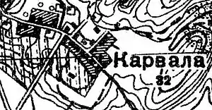 КАРВАЛА — деревня удельная при Кирхгофской высоте, число дворов — 23, число жителей: 39 м. п., 44 ж. п.; Лютеранская кирка[13]. (1862 год)