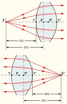 Существует четыре кардинальных точки: задний фокус (бесконечно удалённая точка на оптической оси в пространстве объектов), передний фокус (бесконечно удалённая точка пространства изображений, которая изображена в пространстве объектов) и две так называемые «главные точки» (также передняя и задняя), в которых с оптической осью пересекаются плоскости, взаимно изображаемые оптической системой в натуральную величину. Расстояние от передней главной точки до переднего фокуса называется передним фокусным расстоянием, от задней главной точки до заднего фокуса — задним.