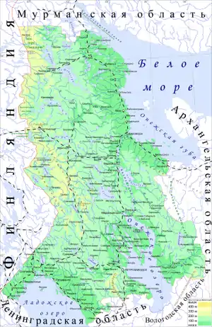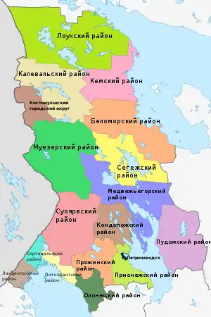 | Крупнейшие города | Петрозаводск, Костомукша, Кондопога, Медвежьегорск, Сортавала, Кемь, Сегежа | ||||