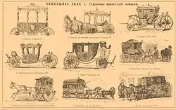 На Руси наиболее древним из колесных экипажей была колымага[3] (колымажка). Словарь русского языка XI—XVII вв. определяет колымагу как «закрытый экипаж шатрового типа с кожаными пологами, закрывающими оконные отверстия». Эта ранняя форма колымаги свидетельствует о её происхождении от колесных повозок кочевых народов. В более позднее время колымаги по внешнему виду мало отличались от карет. Наиболее ранние упоминания о колымагах относятся к XVI веку. Судя по контексту использования слов «колымага» и «колымажка», в этих экипажах передвигались женщины, иногда им пользовались больные и старики[4]. Мужчины из дворянских и боярских родов предпочитали ездить верхом. Об этом сообщал австрийский дипломат Сигизмунд Герберштейн, побывавший в России в 1517 и 1556 гг.[5] Колымаги не могли стать ведущим средством передвижения для знати из-за того, что эти экипажи не имели рессор. Их кузов крепился непосредственно на оси колес. При сколько-нибудь высокой скорости колымаги начинало очень сильно трясти.