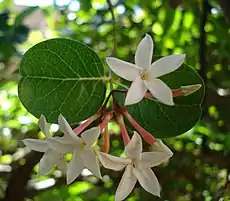 Листья овальные или эллиптические, длиной 2,5—7,5 см, расположены на ветвях попарно, тёмно-зелёные кожистые глянцевые сверху, зелёные снизу.