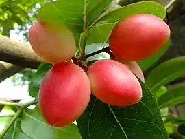 Цветки ароматные белые трубчатые. Плоды продолговатые или круглые, 1,25—2,5 см длиной, с жёсткой гладкой глянцевой багрянисто-красной кожицей, становящейся тёмно-фиолетовой, почти чёрной при полном созревании. Внутри плода содержится кисло-сладкая, иногда горьковатая, сочная красная мякоть с вкраплениями латекса. Иногда в мякоти присутствует от 2 до 8 маленьких плоских коричневых семян.