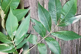Листья крупные, длиной до 50 см, непарноперистые, с 7—9 узко-обратнояйцевидными или ланцетовидными листочками длиной 10—20 см. Рахисы (главные черешки) листьев долго остаются на дереве после опадания листочков, придавая ему своеобразный внешний вид.