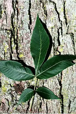 Дерево высотой до 40 метров с узкой кроной и серой трещиноватой корой. Листья длиной до 20—30 см, непарноперистые, с 5 (реже — 3 или 7) ланцетовидными, заострёнными к вершине листочками. Молодые листочки точечно-железистые и опушённые, затем голые. Главный стержень листа и черешки листочков также голые.