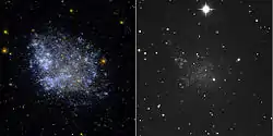 Ряд карликовых неправильных галактик излучает большую часть энергии в голубом и синем участках спектра.[1] Это весьма необычно для галактик, поскольку большинство звезд в них обычно обладает малой массой и имеет максимум светимости в красном участке спектра. Это становится возможным благодаря тому, что в этих галактиках отношения числа ярких молодых звезд к общей массе звезд значительно выше, чем в нормальных галактиках, поэтому они вносят существенный вклад в полную светимость.