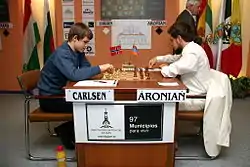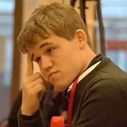 ![]() Карлсен на чемпионате мира ФИДЕ по шахматам Фишера в 2019 году | |