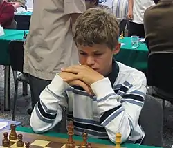 Свен Ма́гнус Э́эн Ка́рлсен (норв. Sven Magnus Øen Carlsen; род. 30 ноября 1990 года, Тёнсберг, губерния Вестфолл, Норвегия) — норвежский шахматист, 16-й (действующий) чемпион мира по шахматам (2013). Чемпион мира по шахматам в трёх категориях: с 2013 года — чемпион мира по классическим шахматам; в 2014—2016, 2019 годах — чемпион мира по рапиду[5]; в 2014—2015, 2017—2019 годах — чемпион мира по блицу[5]. Один из самых молодых гроссмейстеров мира — стал им 26 апреля 2004 года в возрасте 13 лет 4 месяцев 27 дней (на тот момент он был вторым в списке самых молодых гроссмейстеров мира)[6].