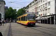 Карлсруэ широко известен в транспортных кругах как мировой пионер в концепции использования железнодорожных путей трамваями в целях создания более эффективной и удобной системы общественного транспорта (см. трамвай-поезд). Воплощённая в жизнь система позволяет добираться до соседних городов (Эттлингена, Бад Херренальба, Пфорцхайма, Бад-Вильдбада, Бреттена, Брухзаля, Хайльбронна, Баден-Бадена и даже до Фройденштадта в Шварцвальде) прямо из центра города с обычной трамвайной остановки.