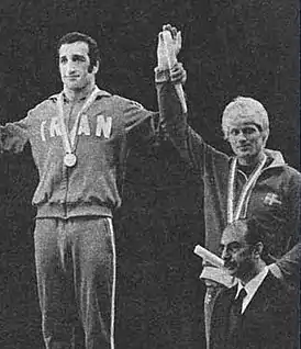 ![]() Ян Карлссон (справа) и Мансур Барзегар на пьедестале почета, Чемпионат мира 1973 года в Тегеране | |