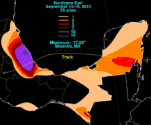 ![]() Ураган Карл на пике интенсивности, вскоре после удара по Мексике 17 сентября 2010 года |