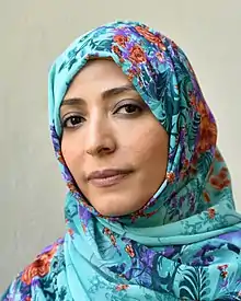 Тавакуль Абдель-Салам Карман (араб. توكل عبد السلام خالد كرمان [Tawakkul ‘Abd us-Salām Karmān], также Таваккуль, Тавакель[10][11][12][13]; родилась 7 февраля 1979 года,[13] Таиз, ЙАР) — йеменская правозащитница, журналистка и политик. Лауреат Нобелевской премии мира за 2011 год совместно с Леймой Гбови и Элен Джонсон-Серлиф «за ненасильственную борьбу за безопасность женщин и за права женщин на полноправное участие в построении мира»[14][15]. Стала первым гражданином Йемена, первой арабской женщиной и второй мусульманкой, получившей Нобелевскую премию,[16] а также одной из самых молодых нобелевских лауреатов[17].