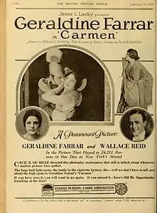 Несмотря на съёмки нескольких удачных фильмов в жанре киноадаптаций модного американского театрального репертуара, успех и внимание публики Демилль привлёк лишь своей шестнадцатой картиной «Кармен». Для исполнения главной роли была привлечена знаменитая оперная певица-сопрано Джеральдина Фаррар[4]. Считается, что сумел её уговорить продюсер Ласки, объяснив, что её участие в картине не сможет нанести ущерб её репутации, а, наоборот, увеличит её аудиторию и сделает её более известной. По мнению Садуля, привлечение певицы в немой фильм понадобилось режиссёру для «пущей страстности»: «Она умела играть глазами и гиперболизировать жесты, чтобы видно было и на галёрке»[2]. Певица, известная своими артистическими способностями на сцене, приняла предложение об участии в съёмках и подписала контракт, согласно которому оставила оперную сцену на два месяца за гонорар в размере за 20 000 долларов. При этом все расходы звезды во время пребывания в Калифорнии брала на себя кинокомпания, а в её распоряжение был предоставлен специальный вагон, в котором она проследовала территорией США, направляясь из Нью-Йорка в Голливуд. В течение нескольких месяцев, проведённых актрисой в Калифорнии, режиссёр снял три ленты с Фаррар в главной роли: «Кармен», «Искушение» и «Мария-Роза»[3].