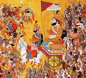 | Карна на Курукшетре (справа) командует армией Кауравов в битве с Арджуной (слева). Аноним, Индия, Химачал-Прадеш или Джамму и Кашмир | |