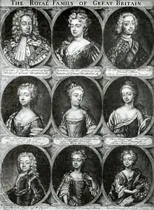 - Анна (1709—1759) — Королевская принцесса[76]; была замужем за Вильгельмом IV Оранским, первым наследственным штатгальтером Нидерландов; в браке родилось пятеро детей, из которых только двое достигли зрелого возраста — Каролина и Вильгельм[147][148];