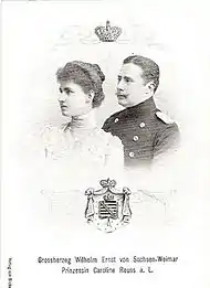 10 декабря 1902 года было объявлено о помолвке правящего великого герцога Саксен-Веймар-Эйзенахского Вильгельма Эрнеста и принцессы Каролины Рейсской.[3] Поженились 30 апреля 1903 года в доме дяди принцессы.[4] Брак был заключен из династических соображений. Принцесса не хотела выходить замуж за Вильгельма, но под нажимом германского императора и императрицы, которые присутствовали на свадьбе, она согласилась на брак.[5] В день свадьбы на невесте было атласное белое платье, отделанное кружевами. На свадьбе присутствовали королева Вильгельмина Нидерландская с супругом принцем-консортом Генрихом Мекленбургским.[6]