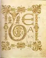 Требник Дрого | Около 842 | Мец | Сакраментарий; 41 полностраничный инициал, текст полностью выполнен в технике хризографии | Париж, Национальная библиотека Франции, Ms. lat. 9428 |