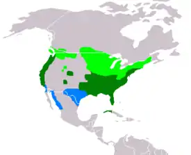 Самый крупный участок ареала охватывает восточную половину материка от атлантического побережья к западу до Манитобы, долины Миссури на Великих Равнинах (Северная и Южная Дакоты), восточной Небраски, восточного Канзаса, Оклахомы и центральных областей Техаса. Северная граница гнездовий находится в пределах южной Канады: она тянется от озера Виннипег к востоку до Новой Шотландии через северную оконечность Великих озёр, районы Су-сент-мари и Норт-Бей в Онтарио, долину реки Оттава в промежутке между столицей Канады и Монреалем, долину реки Святого Лаврентия и южный Квебек. С юга гнездовой ареал ограничен юго-восточной частью Техаса и побережьем Мексиканского залива до южных районов Флориды[8].
