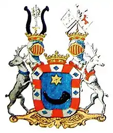 В лазоревом поле горизонтально положенный воловий рог и над ним золотая шестиугольная звезда. Щит окаймлен широкой полосой, состоящею из четырнадцати отделений: семи красных, семи белых, и в каждом из белых отделений лазоревый лозанж.
