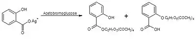 - Каррер показал интересную особенность реакции серебряных солей о-гидрокси-, о-аминокарбоновых кислот, а также α-гидроксикарбоновых кислот с ацетобромглюкозой: кроме ожидаемых ацетилированных эфиров сахаров образуются также ацетилированные кислоты. В некоторых случаях наблюдается также образование дизамещенных продуктов[4].